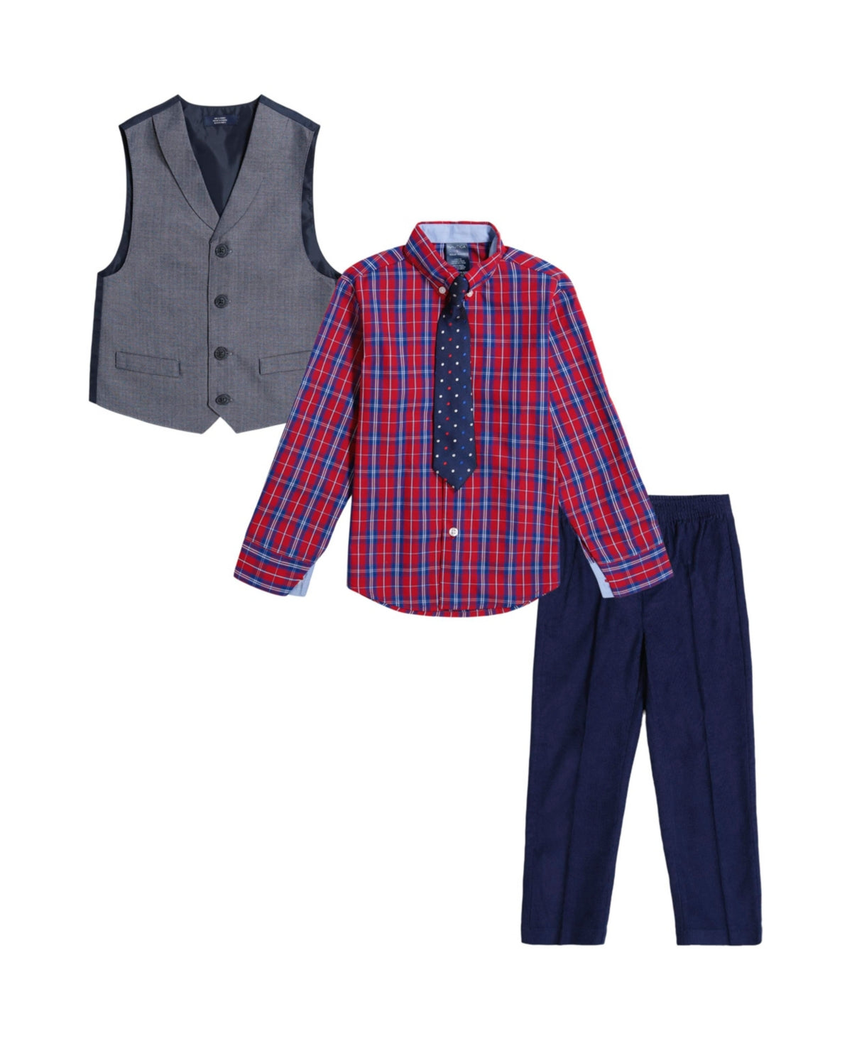 When your little guy needs an adorably tailored outfit this vest set from Nautica is top choice, featuring a herringbone lapel vest and pants, with check plaid shirt and a playful dotted tie.
